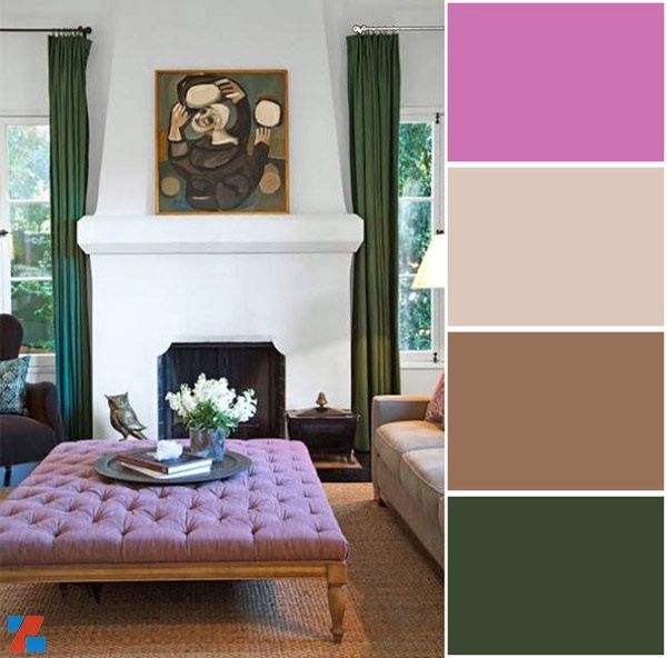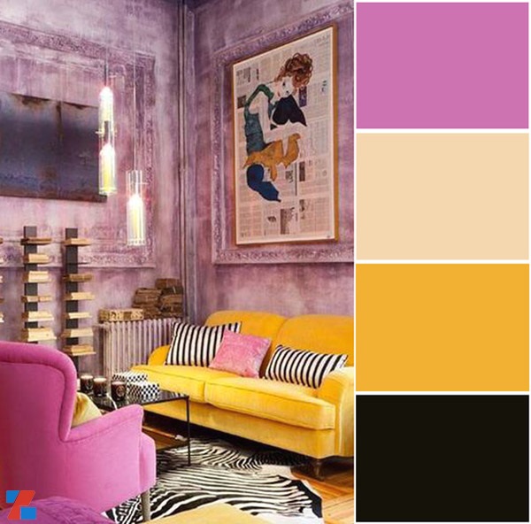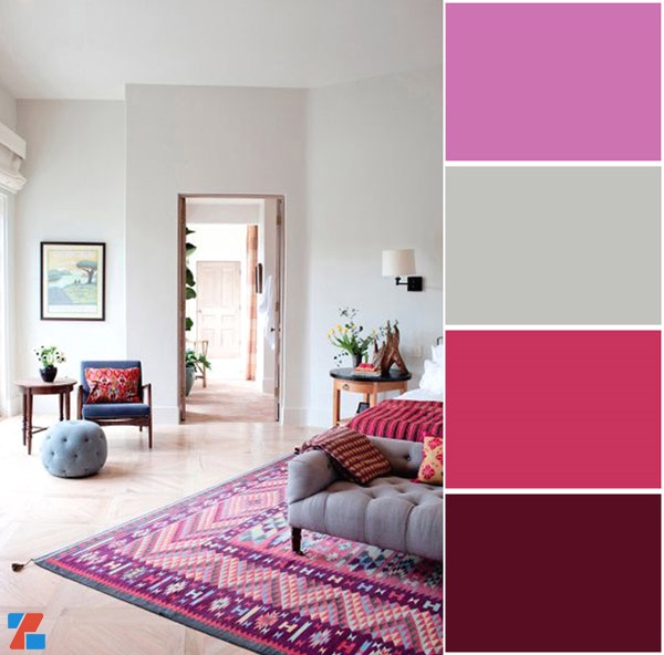 Nếu bạn muốn có một không gian vui tươi thì hãy phối hợp màu tím với màu hồng. đỏ hay nâu. Hãy sử dụng các sản phẩm dệt sắc màu để tạo ra cái nhìn sống động. Tuy nhiên, hãy thêm vào một số màu trung lập để tránh cái nhìn độc đoán.
